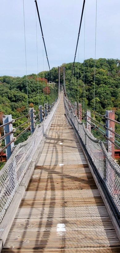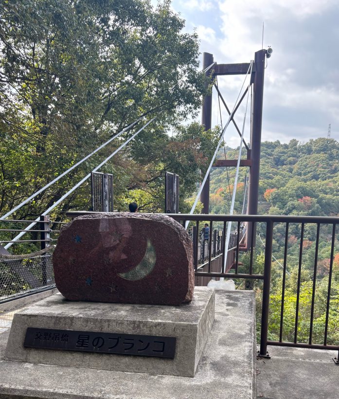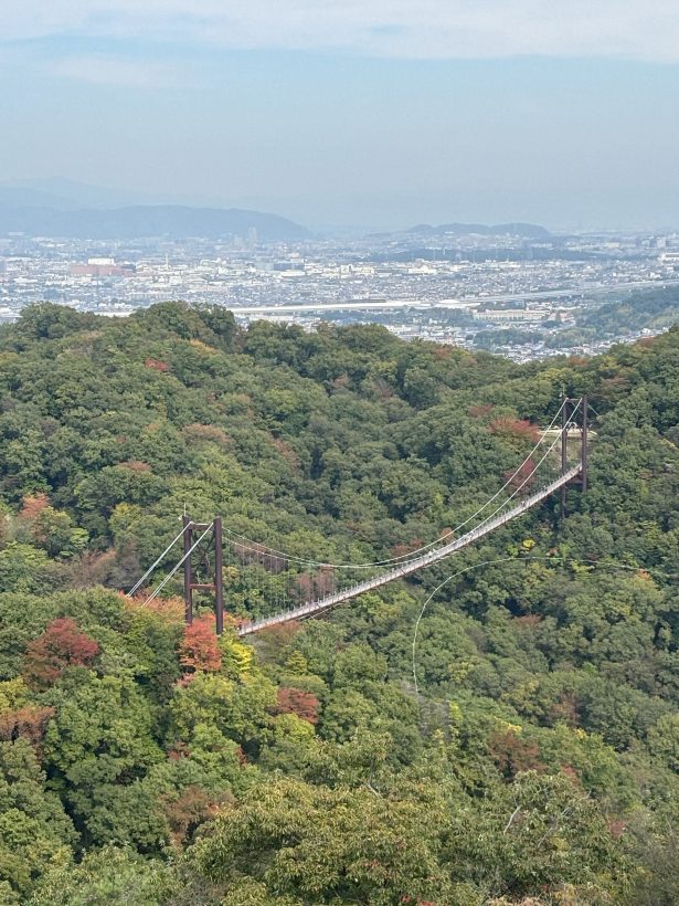 星のブランコは、大阪・交野市の自然に囲まれた、全長約280mのスケールと最大地上高50mの日本最大級の木床版人道吊り橋です。
