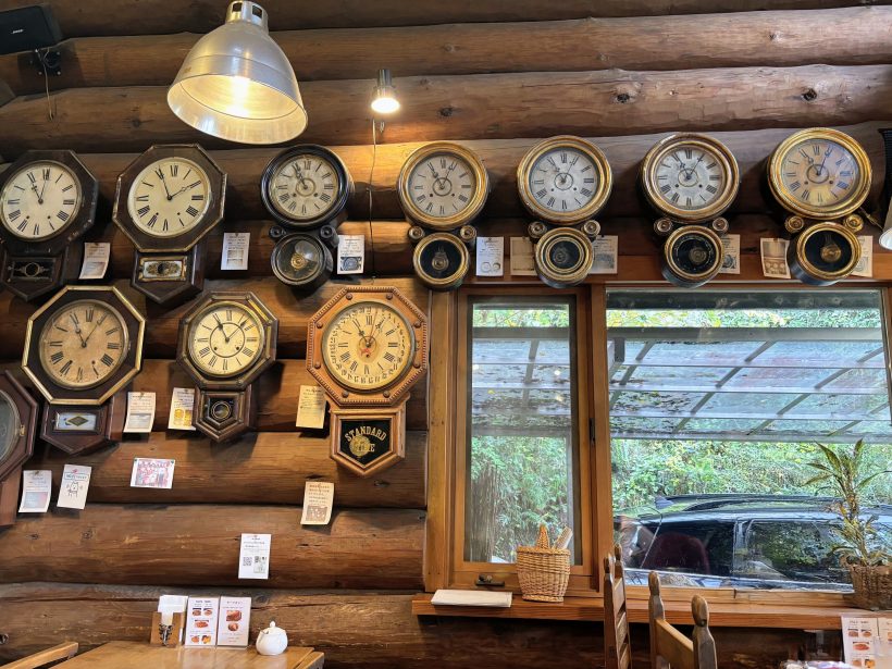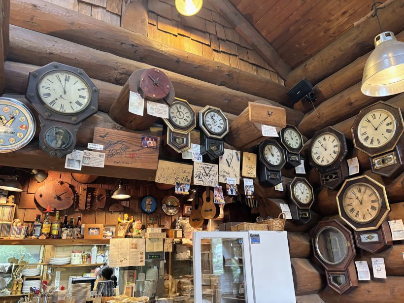 店内はログハウスになっていて沢山の古時計が飾られています👀